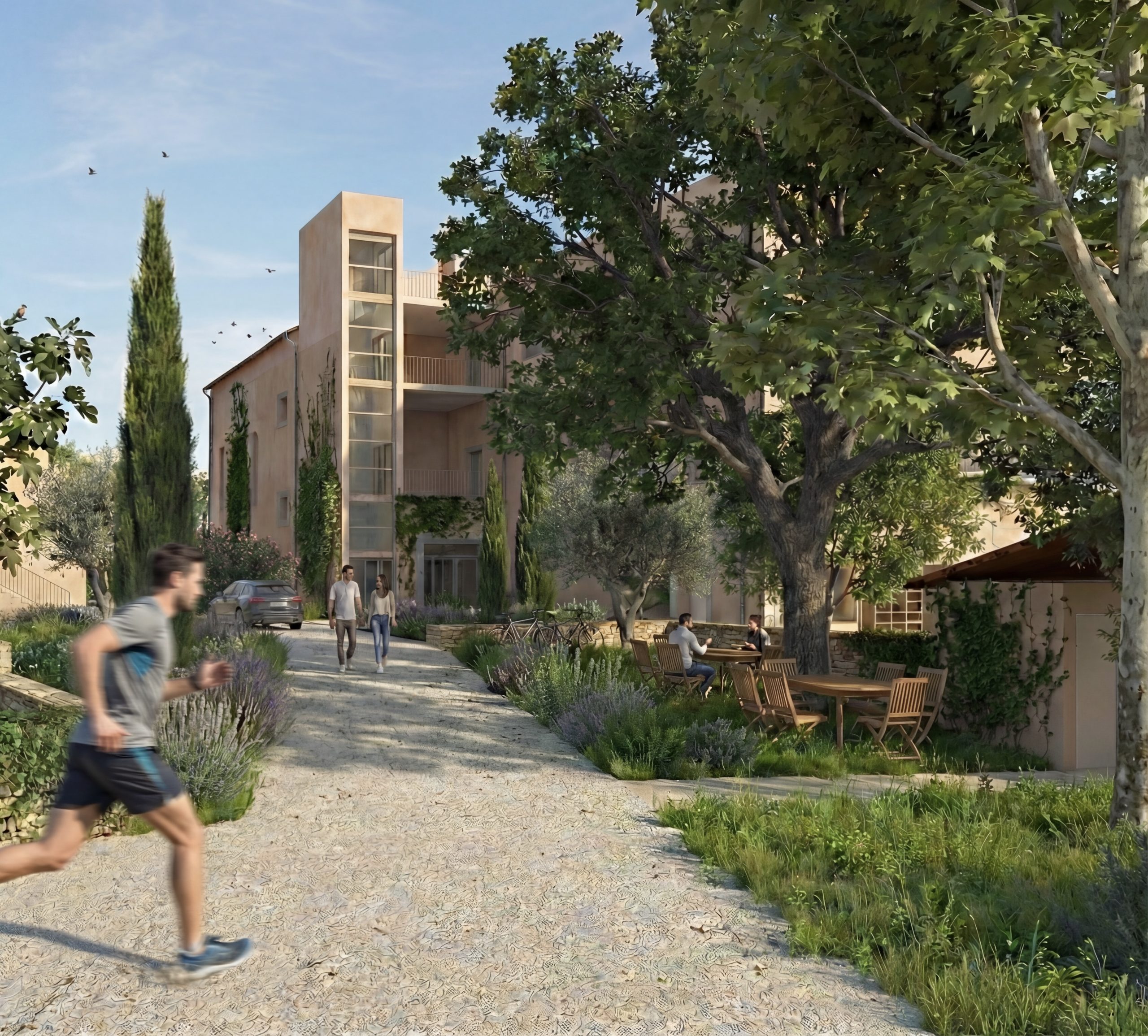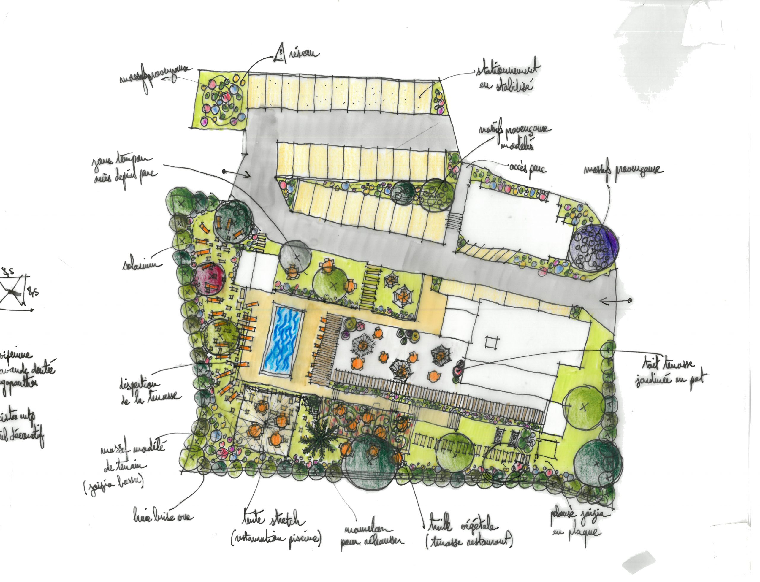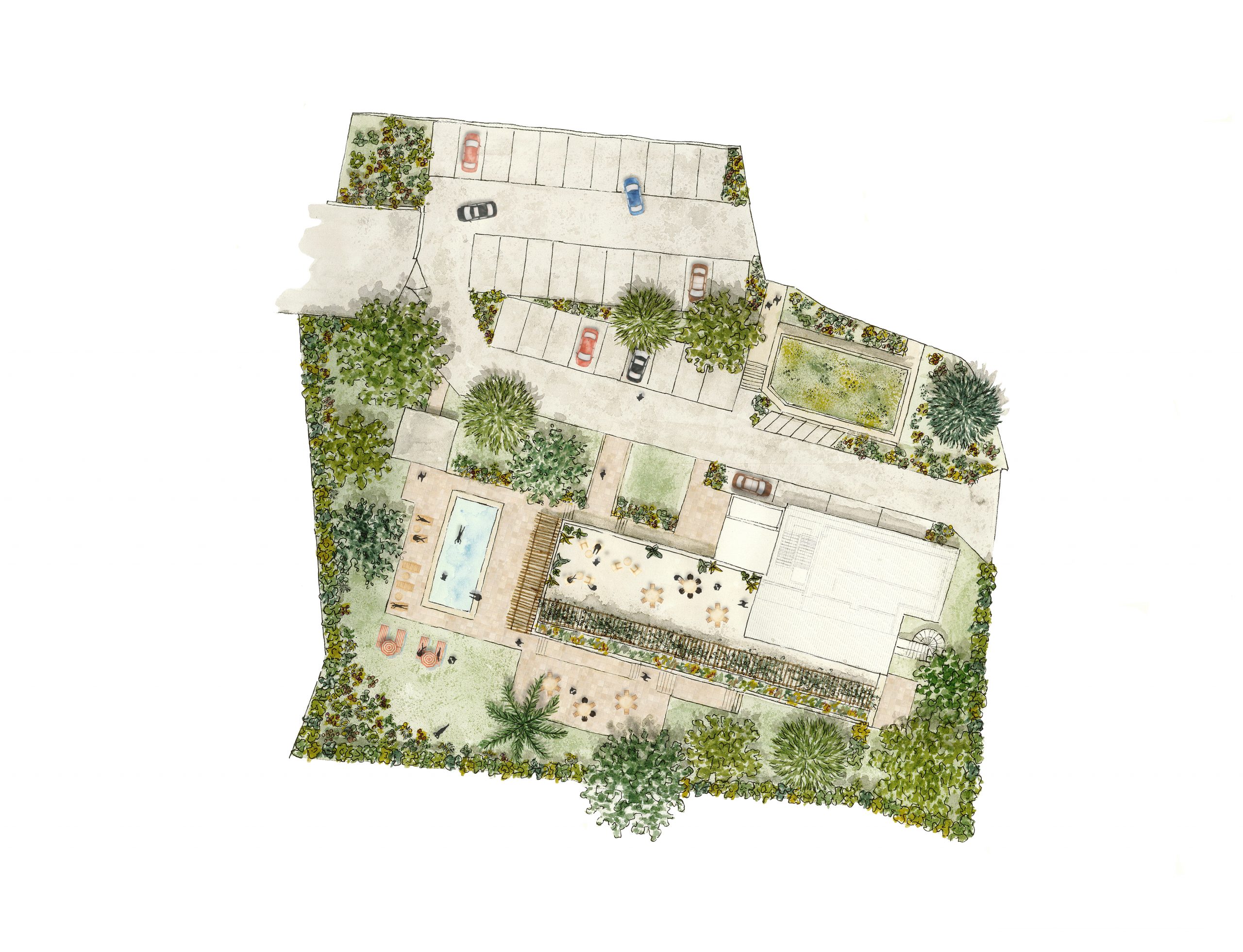 Les abords du bâtiment font l’objet d’une désimperméabilisation partielle. Un espace de stationnement perméable est aménagé, bordé de massifs plantés. Face au restaurant, une piscine prend place au sein d’un aménagement intimiste, pensé comme un cocon végétal. À la place des anciens garages, un gymnase est créé. Son toit est entièrement végétalisé en sédums et équipé d’un système de récupération des eaux pluviales.