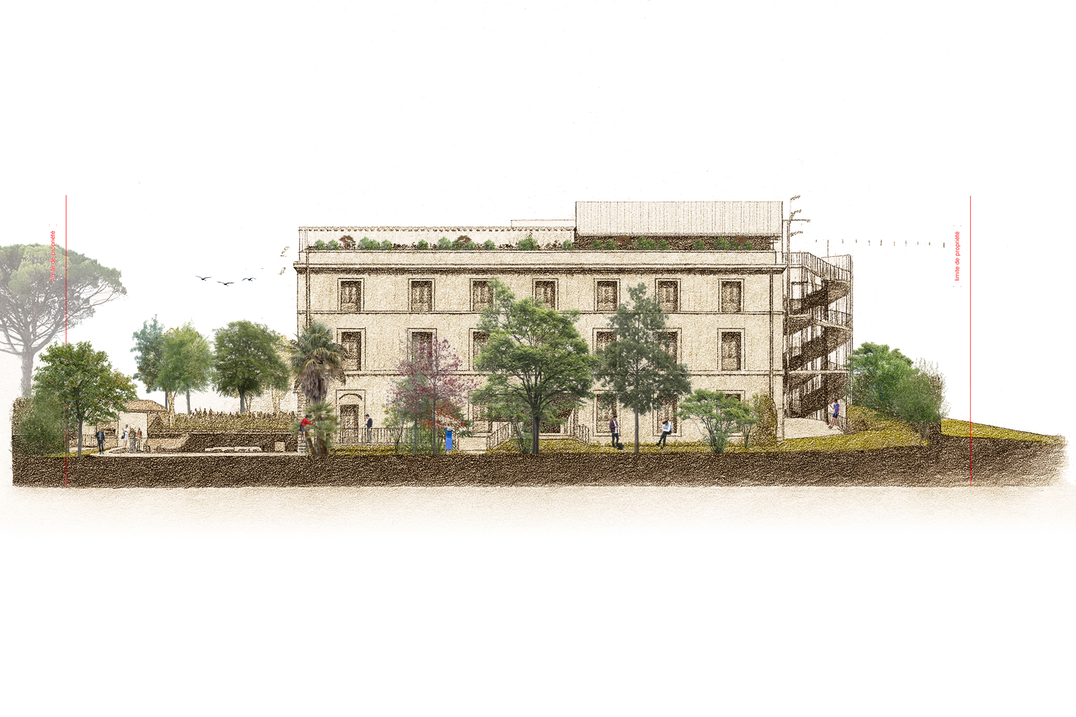 La structure existante du bâtiment est conservée, les essences végétales structurantes sont préservées et mises en valeur. Le toit-terrasse est ouvert et aménagé en rooftop végétalisé, offrant une vue dégagée sur l’ensemble de la ville et la Méditerranée. Il accueille une guinguette durant la saison estivale.