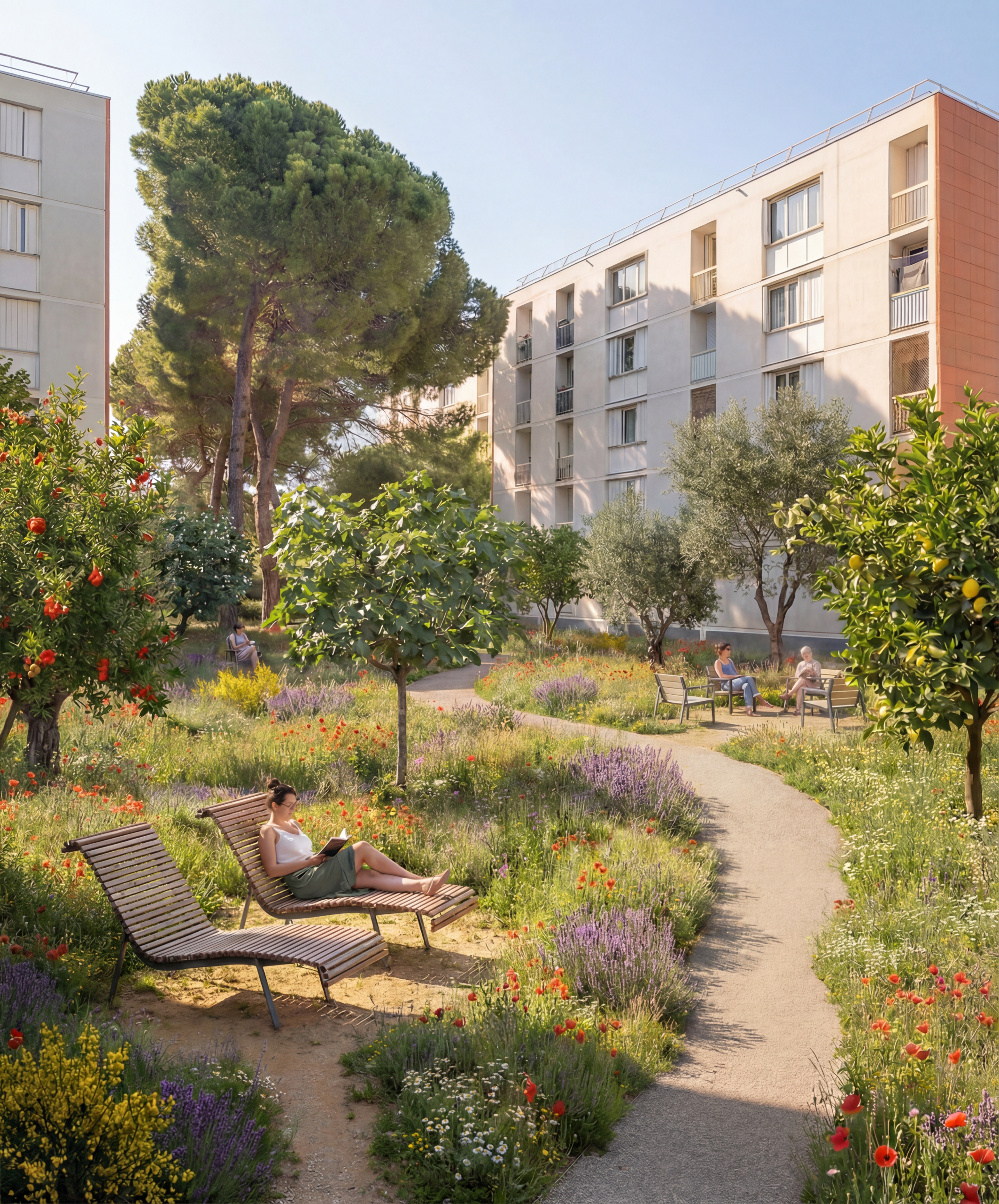 Pour ce projet, l’Atelier AOP a été sollicité par CDC Habitat pour repenser les extérieurs de deux immeubles à La Valette-du-Var. Ces espaces, restés inchangés depuis les années 60, nécessitaient d’être réinventés et végétalisés. Nous avons commencé par un état des lieux détaillé des usages et des ambiances, avant de rédiger des fiches actions pour présenter nos intentions.