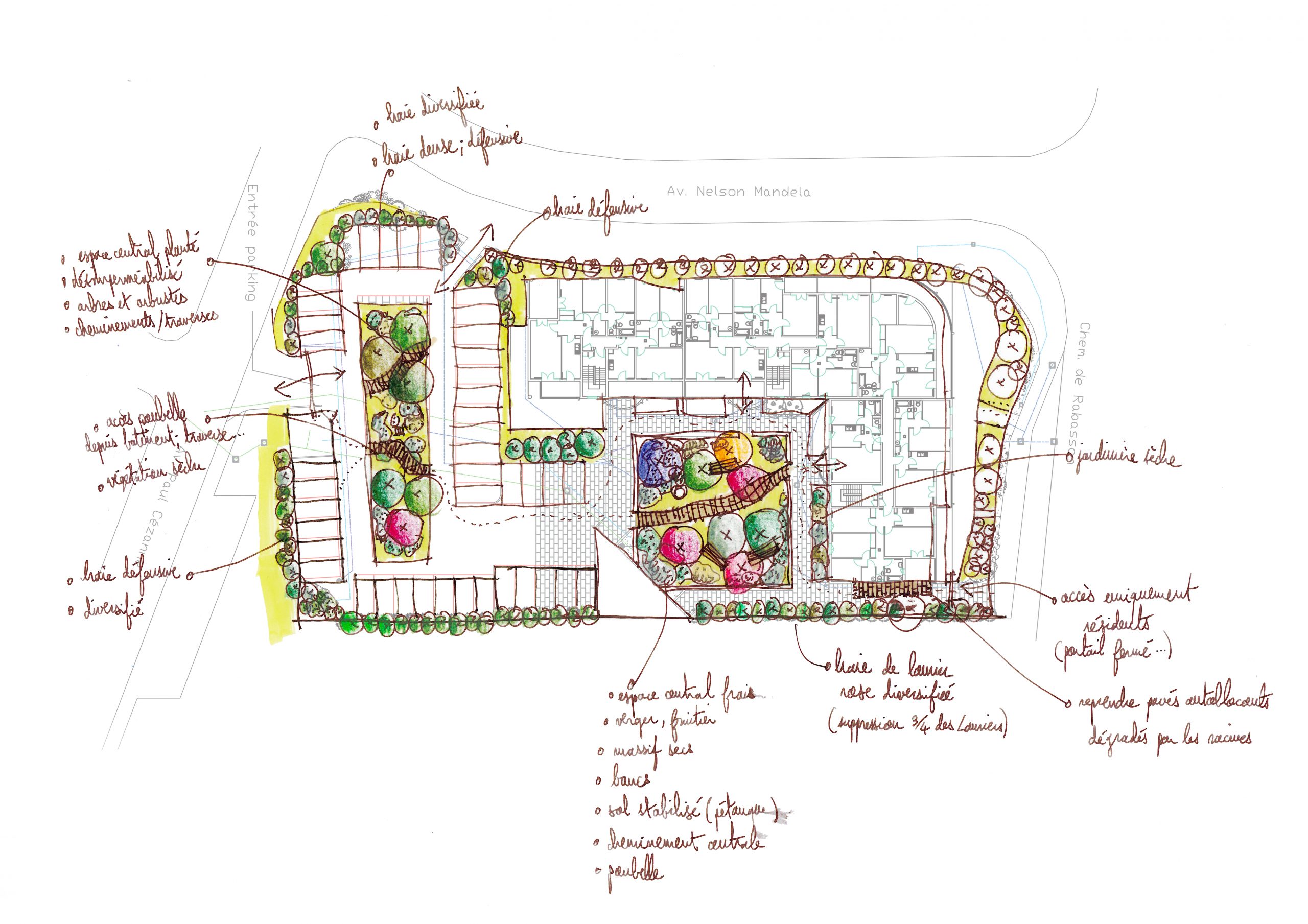 Nous avons d’abord réalisé un diagnostic détaillé des usages et des ambiances, puis rédigé des fiches actions afin de présenter nos intentions d’aménagement. Ce travail a permis d’obtenir une subvention dans le cadre de l’appel à projets « Nature ta ville », un dispositif régional qui encourage la renaturation des quartiers. Cette aide publique finance à la fois l’étude et une partie des travaux.